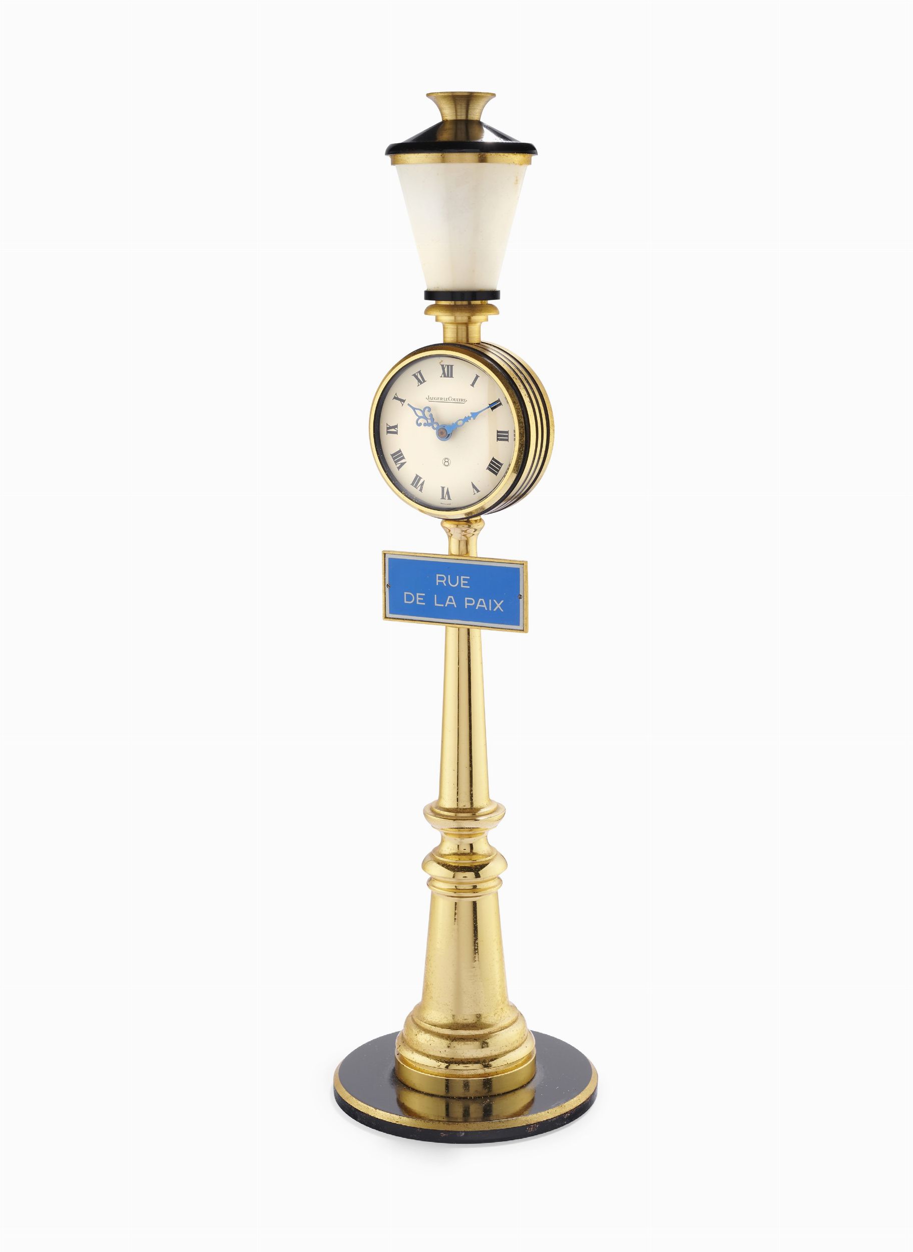 Orologio a forma di lampione in ottone dorato e laccatura nera e bianca.