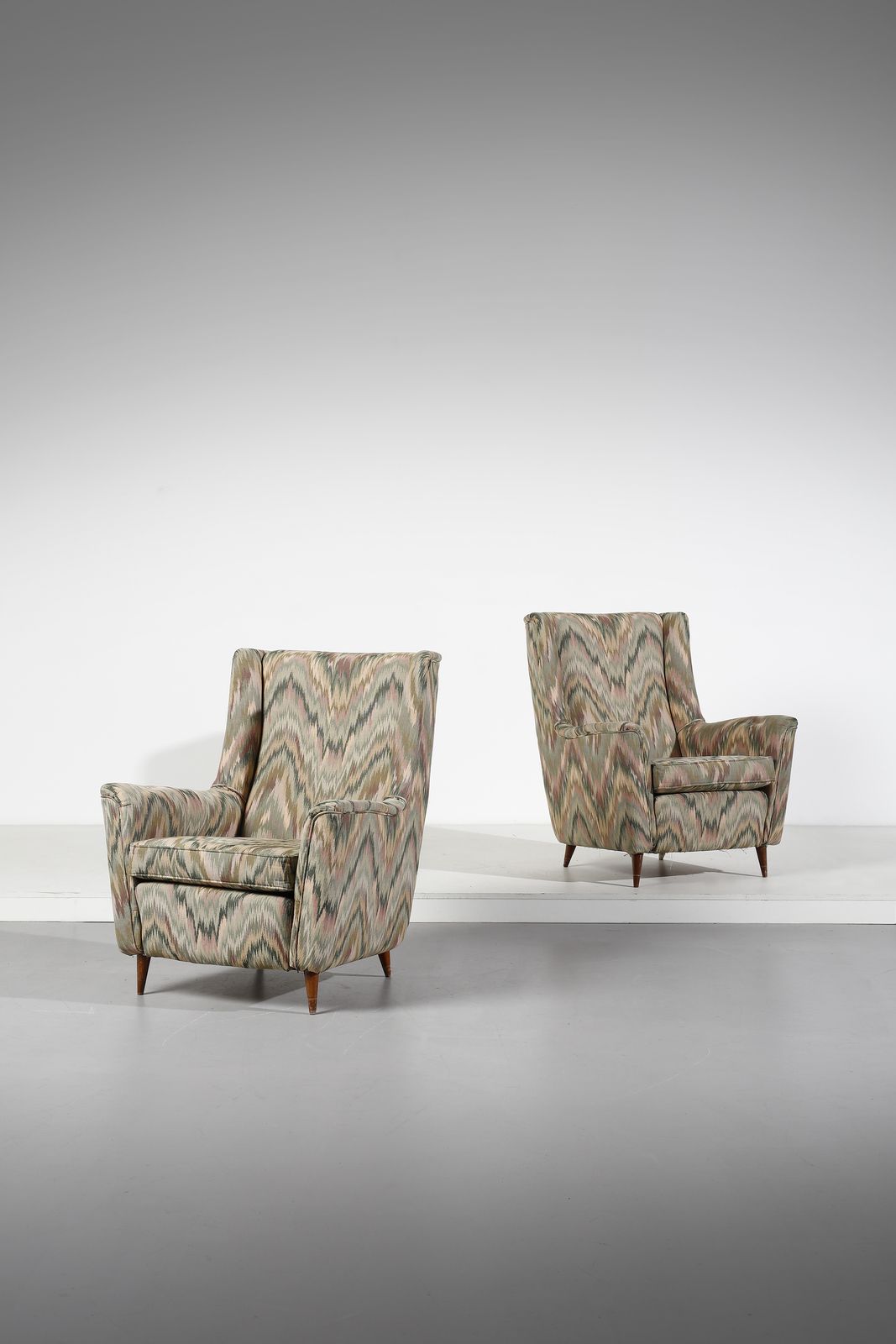 PARISI ICO (1916 - 1996) Coppia di poltrone per Ariberto Colombo, Cantu. 1951. Legno e tessuto imbottito.. Cm 95x70x65. Bibliografia: R. Lietti, Ico Parisi. Design. Catalogo ragionato 1936-1960, Silviana Editoriale, 2017