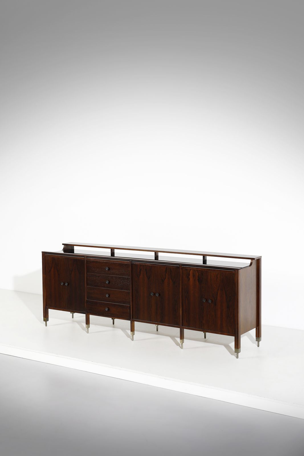 DE CARLI CARLO (1910 - 1999) Credenza per Sormani. 1964. Legno di palissandro e ottone.. Cm 86x230x49. Bibliografia: Domus n.410, gennaio 1964, p. d/190. P. Toschi, F. Magnani, Abitare oggi, Gorlich, Milano, 1967, p. 187, 188. Rivista dell'Arredamento n.197, Dicembre 1963, copertina