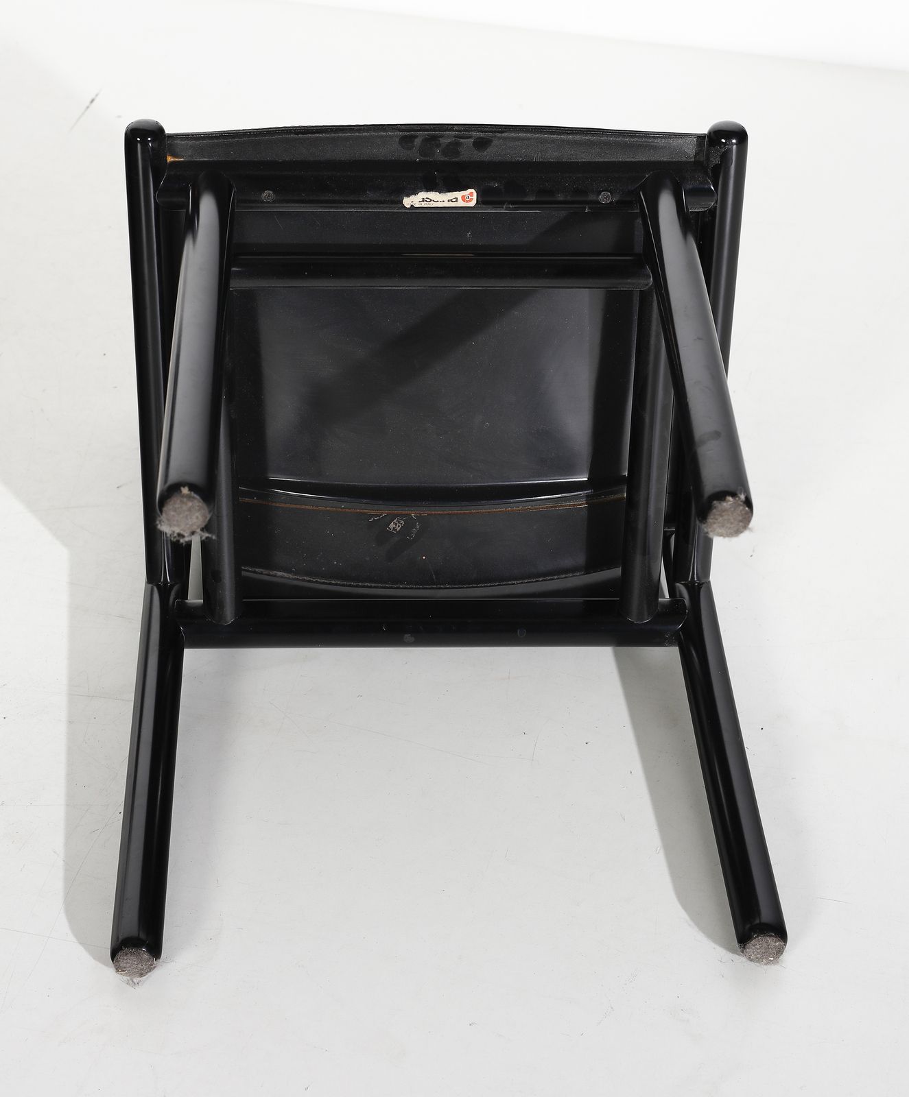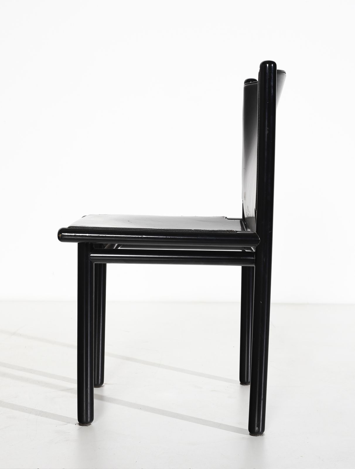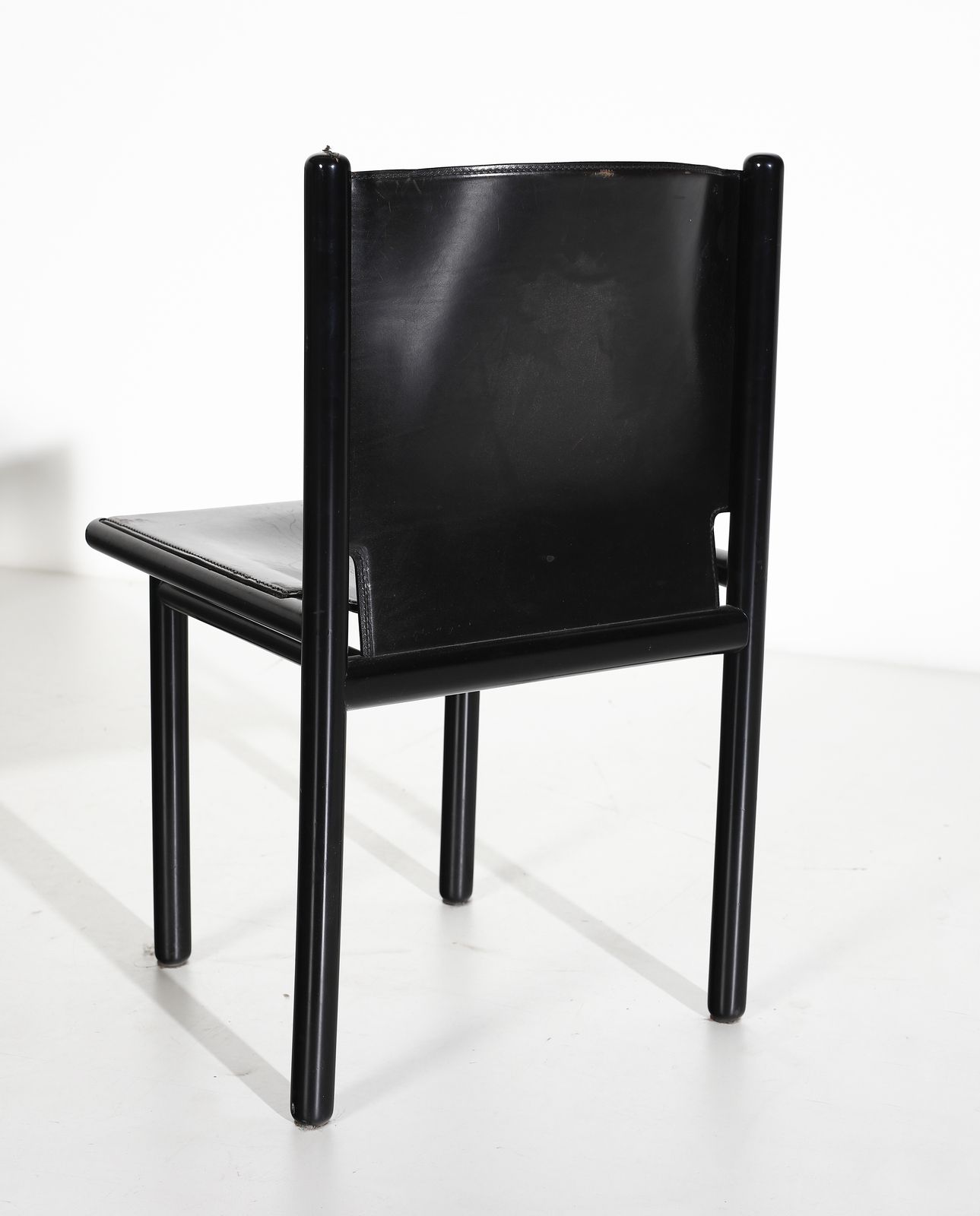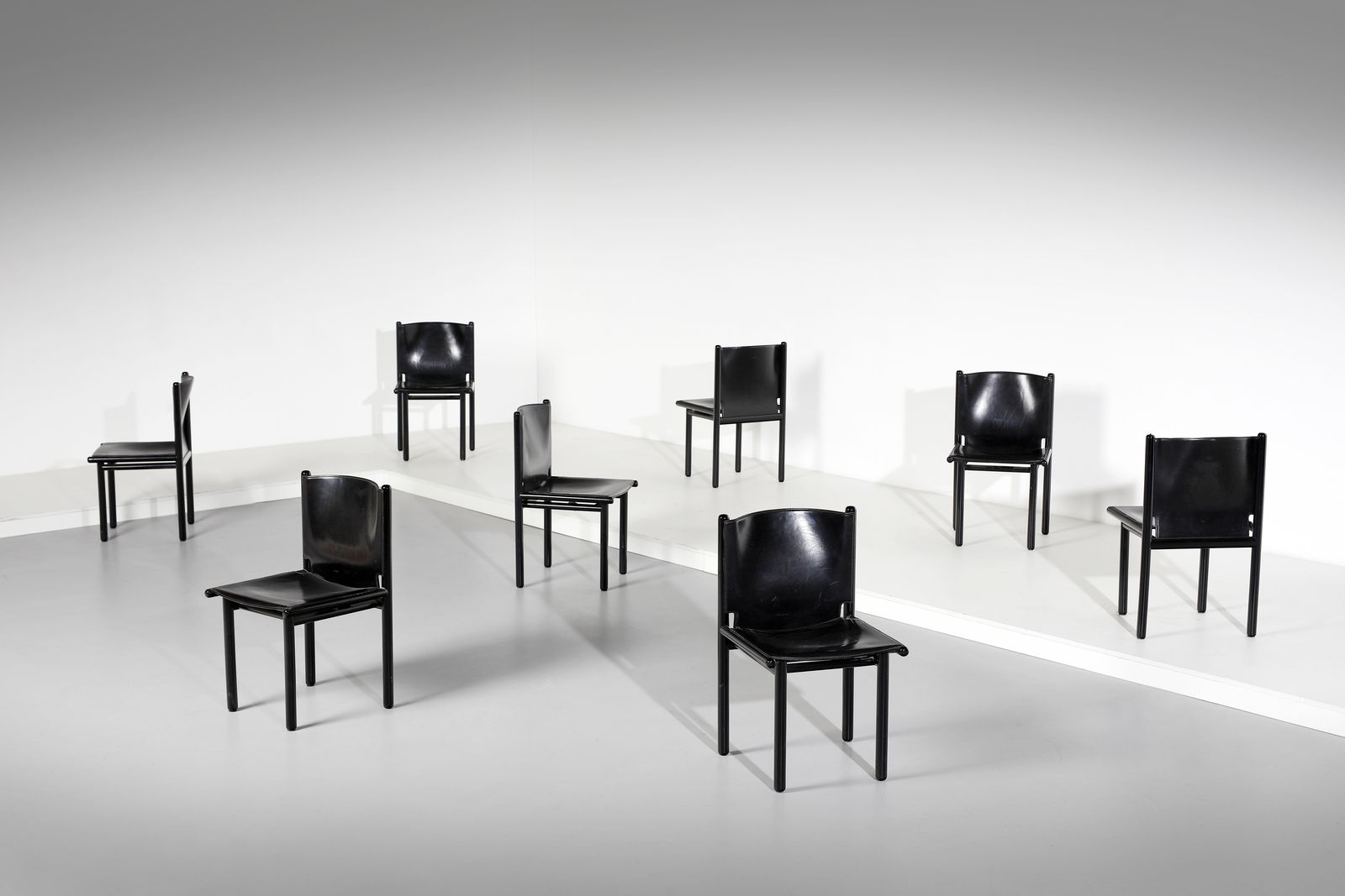 FRATTINI GIANFRANCO (1926 - 2004) Otto sedie Caprile per Cassina. Legno laccato e cuoio. Cm 80x47x50. Etichetta della manifattura, anni Ottanta.