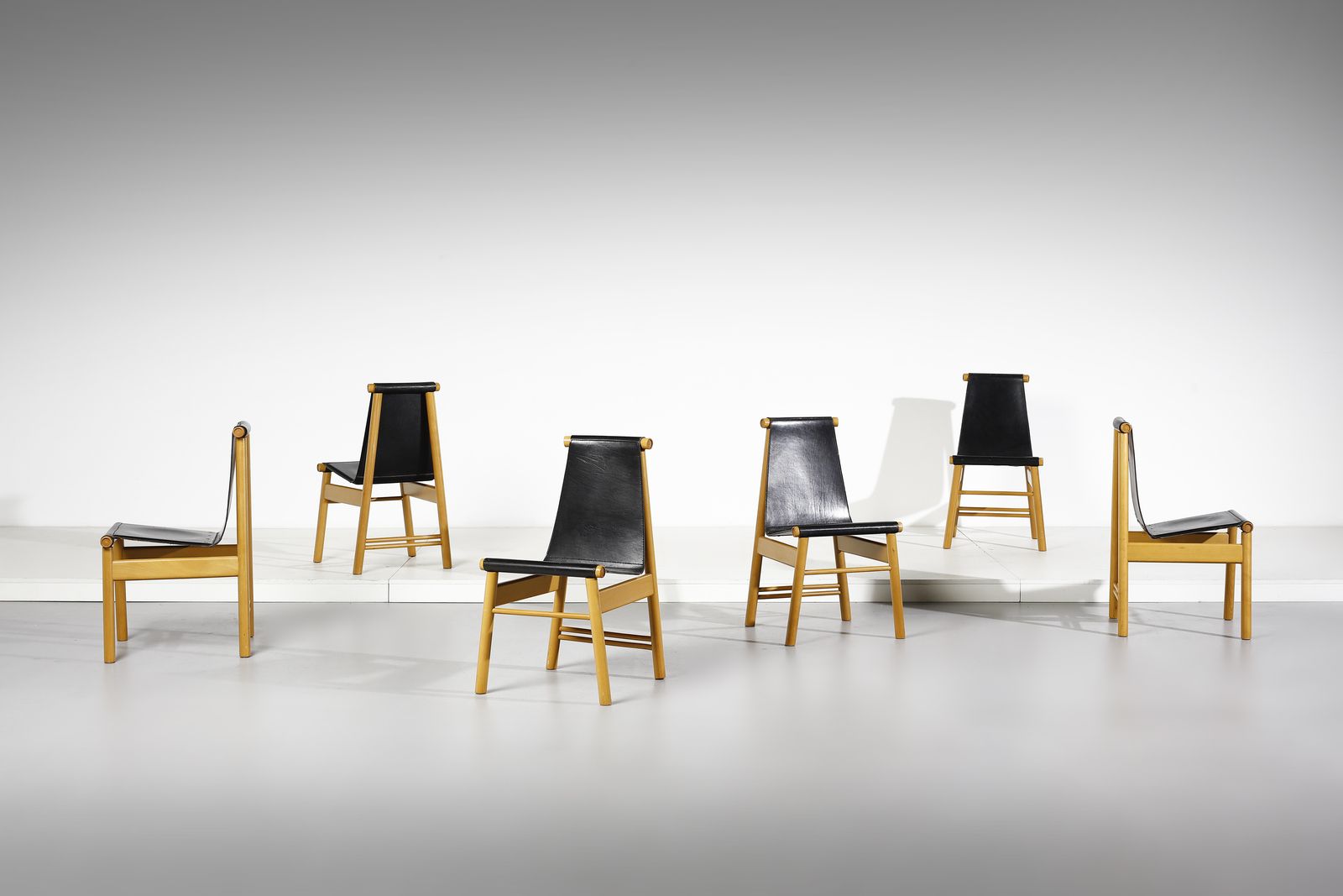 IBISCO SEDIE Sei sedie. Legno di faggio e cuoio.. Cm 87x46x52. anni Ottanta.