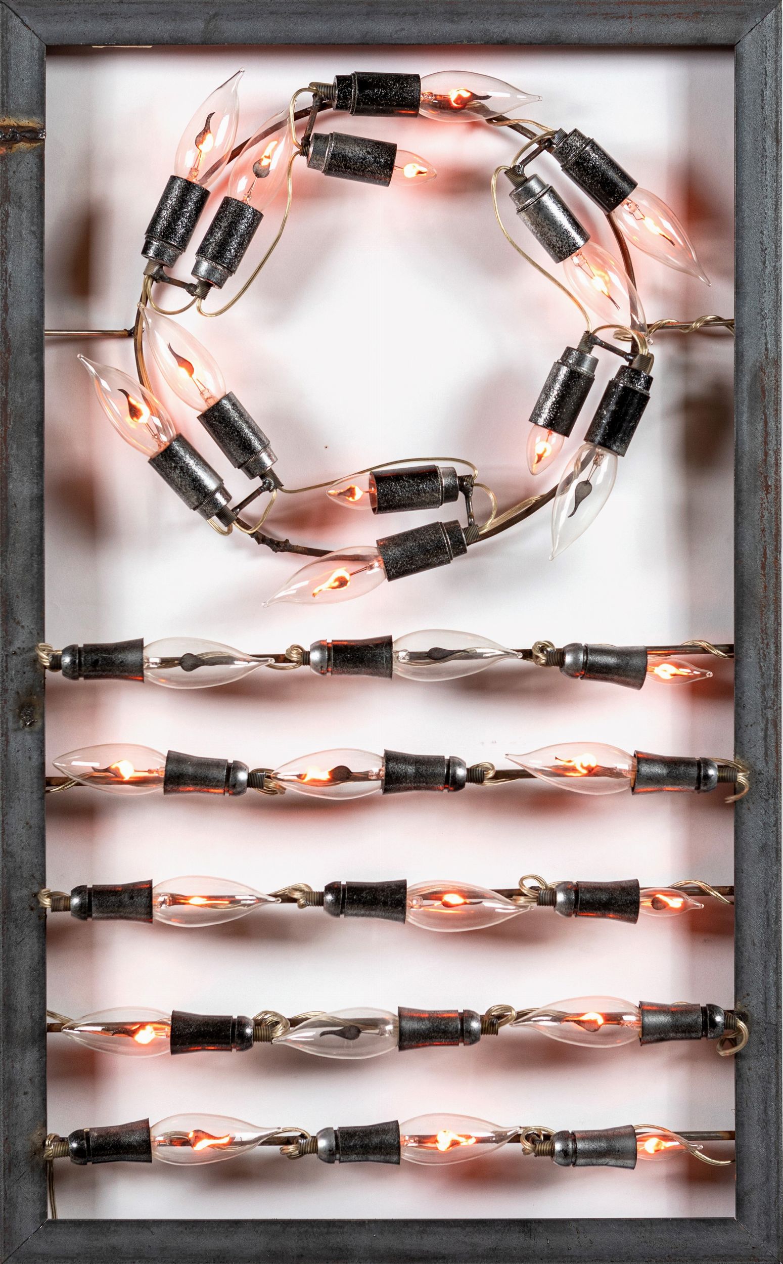 Scultura in metallo e lampadine, cm 79,5x48,5x3