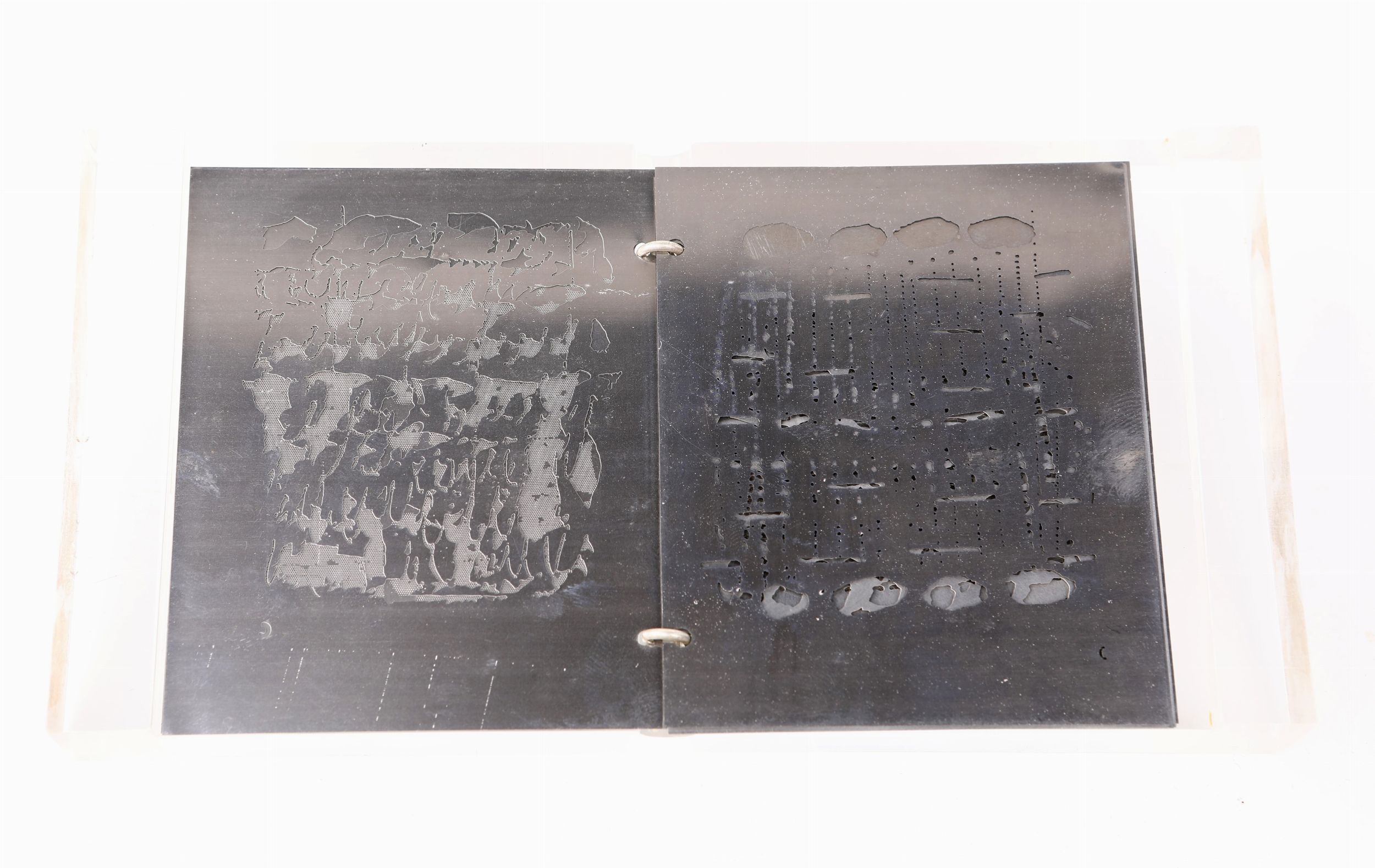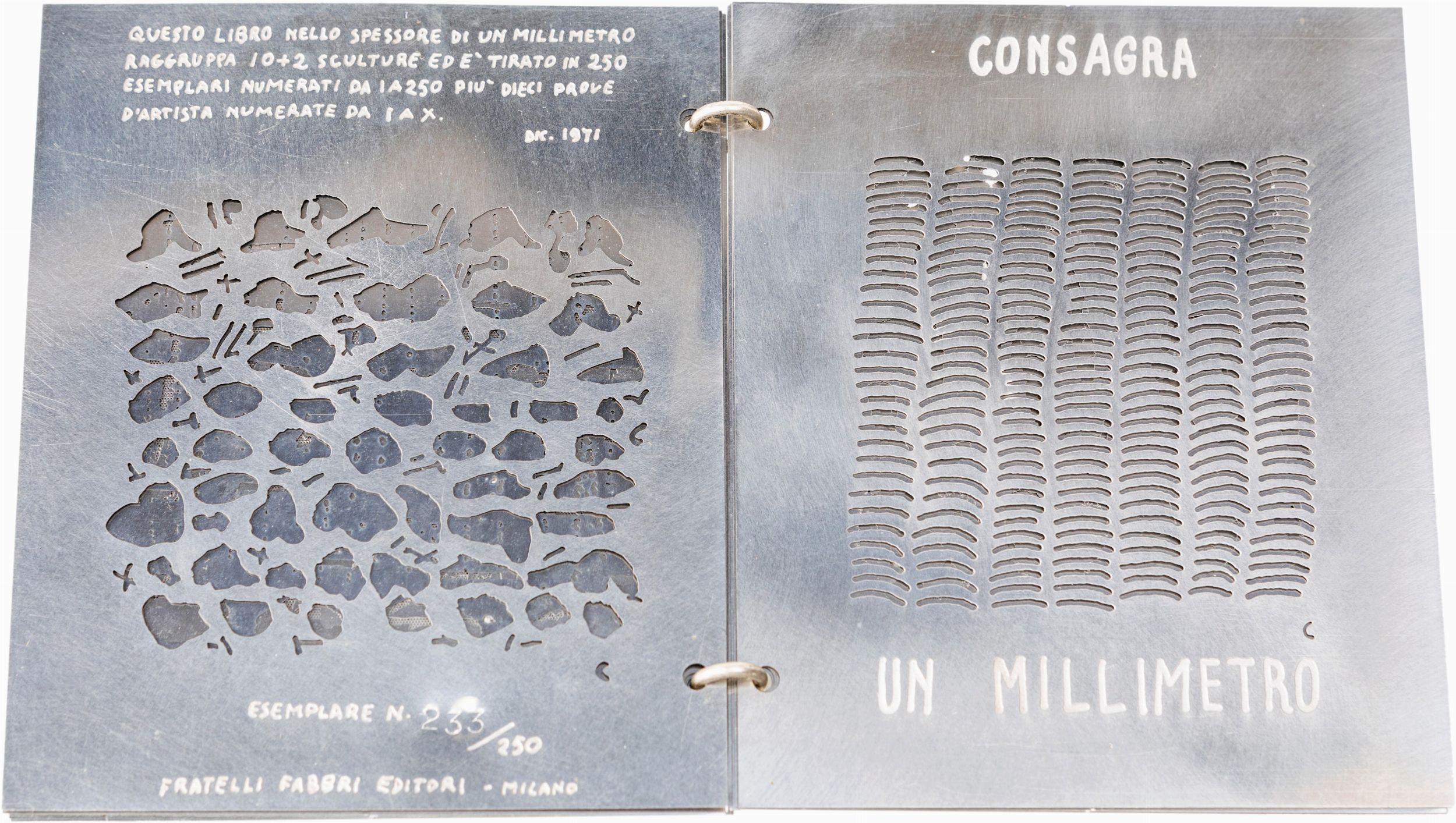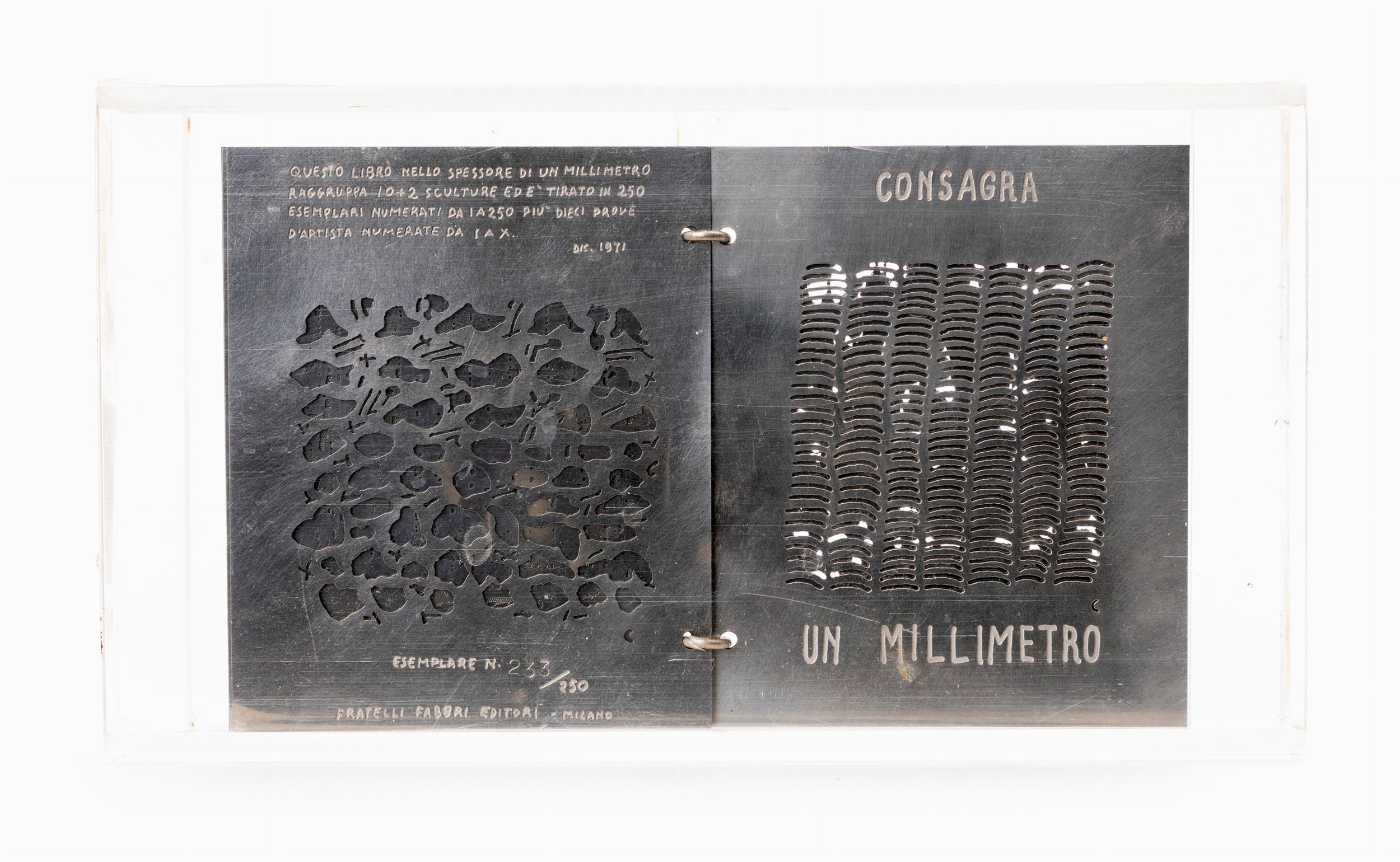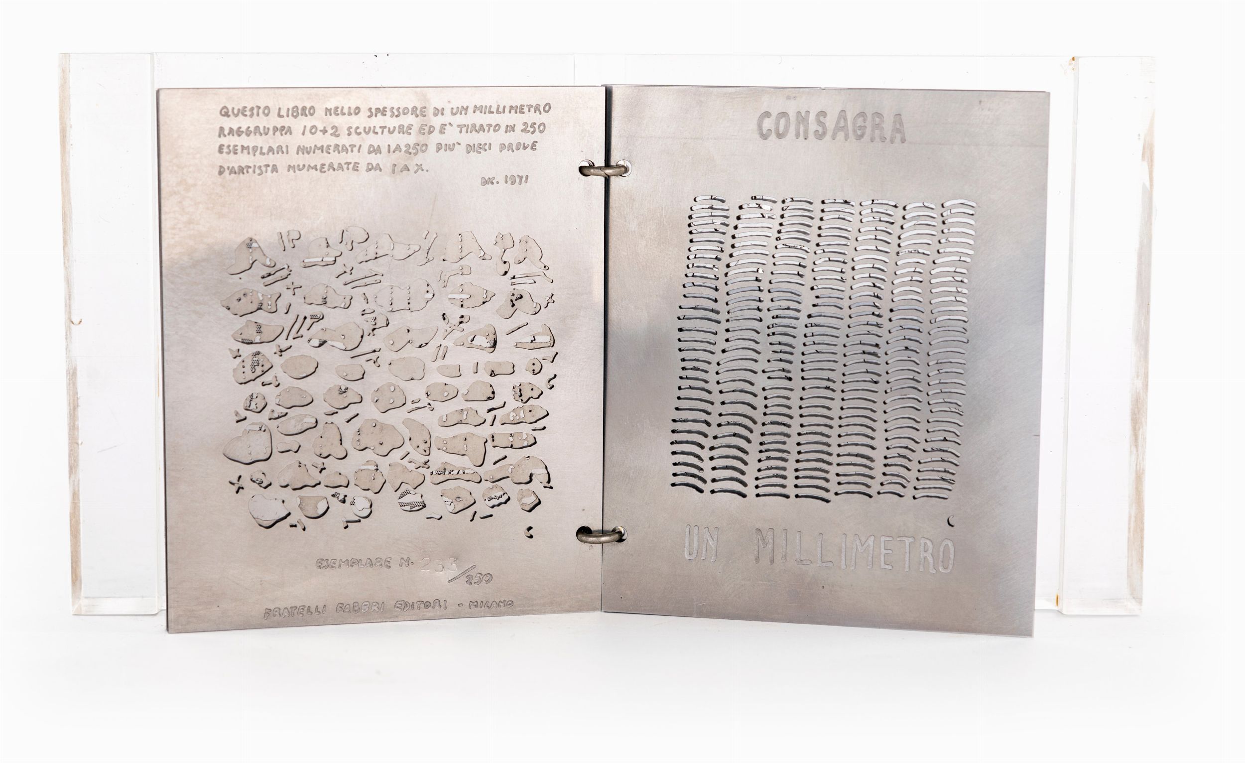 1971 L'opera misura da chiusa cm cm 8,5x7x0,1 ; a pagine aperte misura cm 8,5x14x0,1 - entro piccola teca in plexiglass cm 10x17,5. Numerata 233/250 sul fronte.