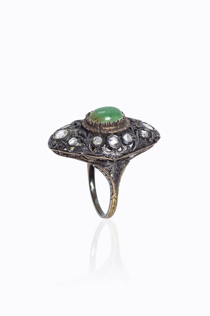 in oro giallo a bassa caratura ed argento, sommità a losanga, con al centro smeraldo cabochon e rosette di diamanti