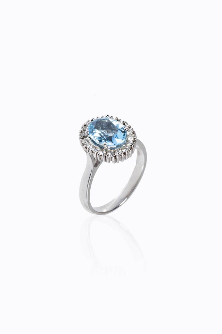 in oro bianco, al centro acquamarina taglio ovale contornata da diamanti taglio brillante per totali ct 0,36 ca, probabile colore G-H, purezza IF-VVS