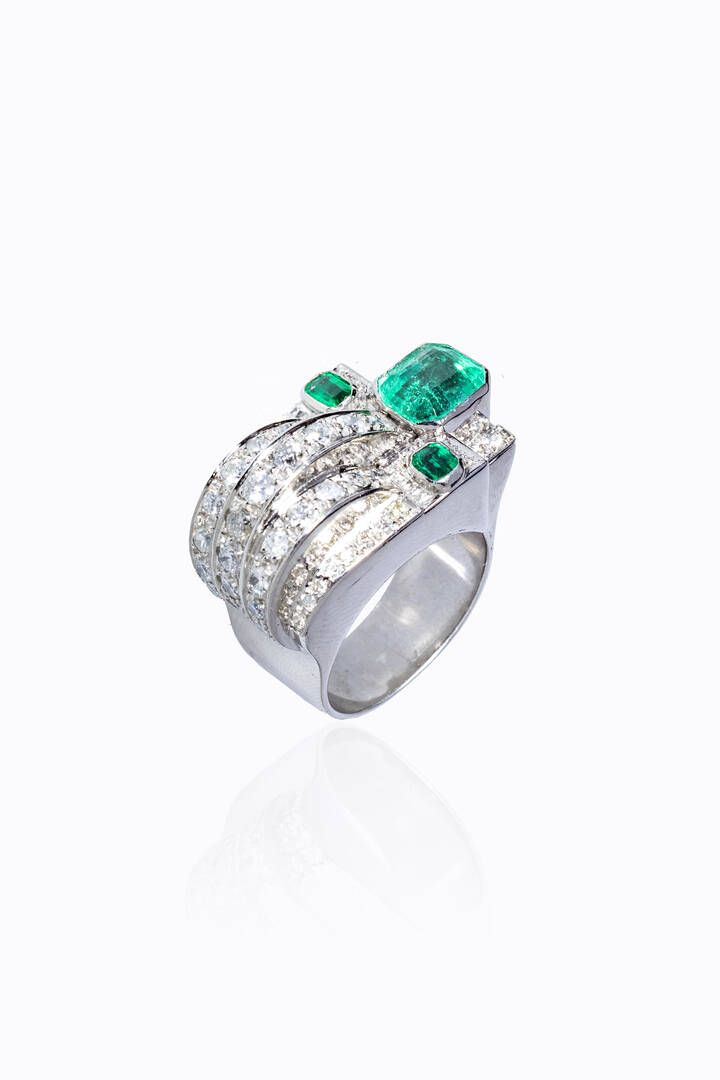 in platino, anni '40, sommità piatta con voluta laterale con diamanti taglio brillante, 8/8, 16/16 per totali ct 1,50 ca e tre smeraldi per totali ct 2,0 ca