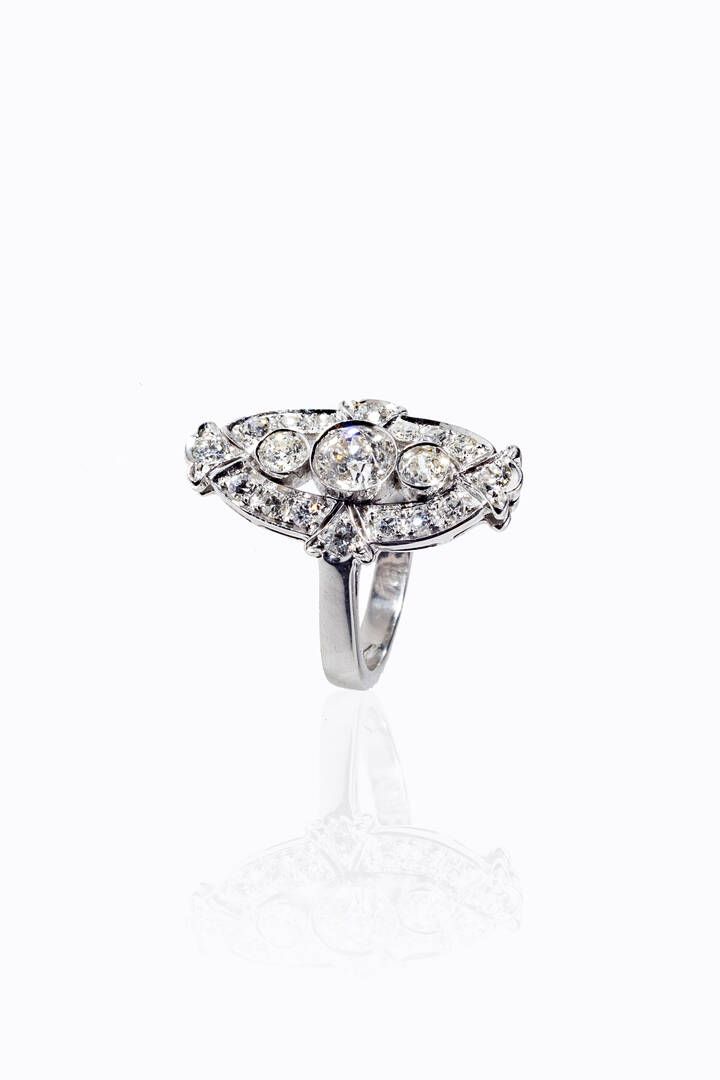 in oro bianco, sommità a losanga, con diamanti taglio brillante, di vecchio taglio e 8/8 per totali ct 1,45 ca, probabile colore G-H, purezza IF-