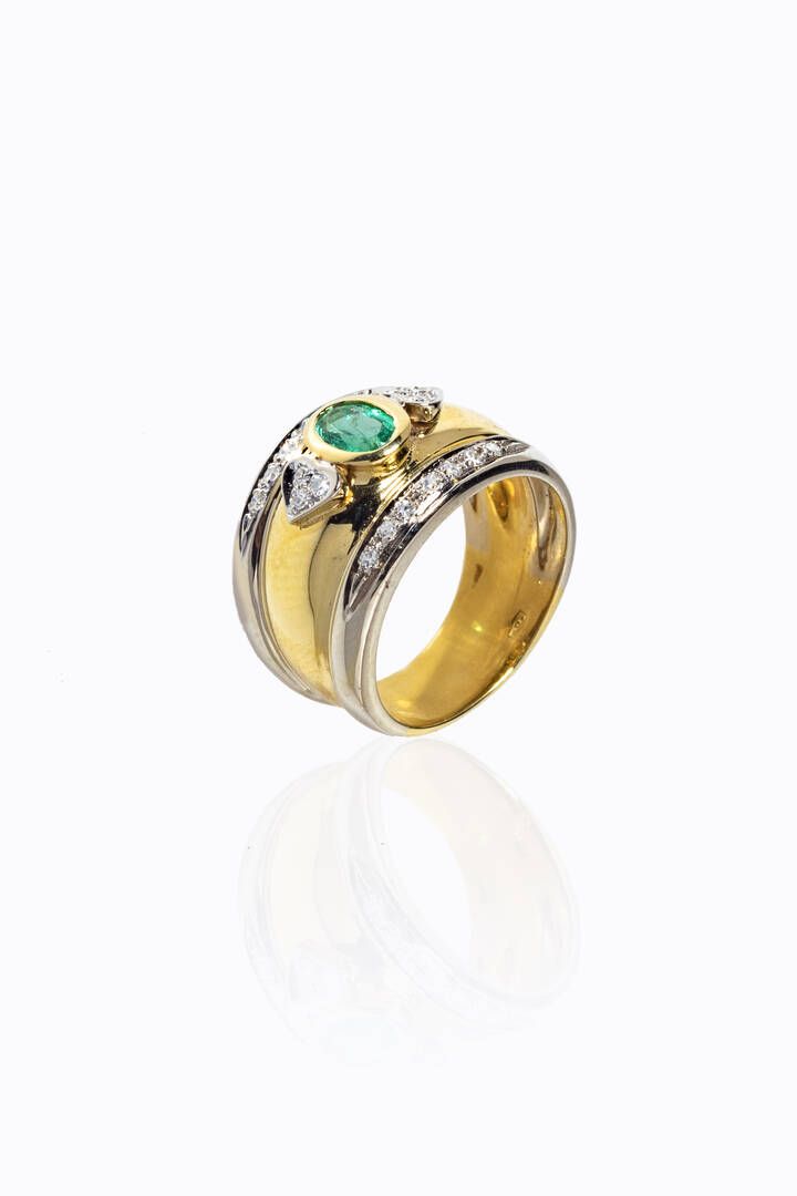in oro giallo e bianco, a fascia, al centro smeraldo centrale di ct 0,30 ca e diamantini taglio 8/8 per totali ct 0,20 ca