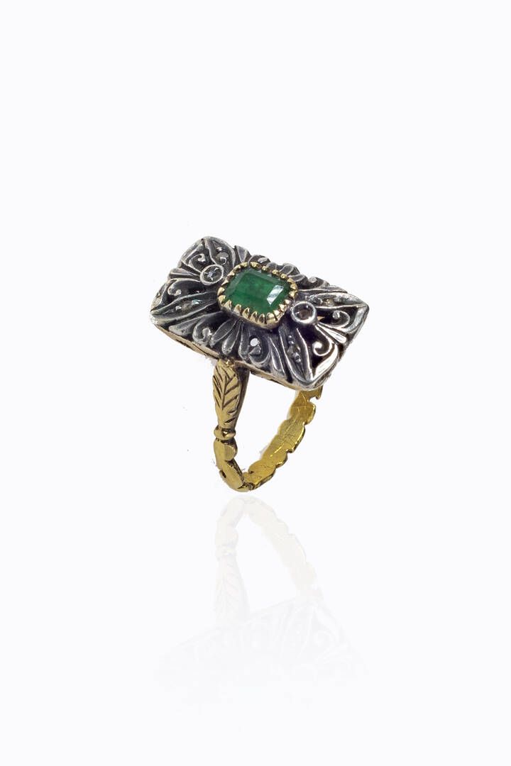 in oro giallo ed argento, di forma rettangolare con al centro smeraldo taglio ottagonale a gradini di ct 0,80 ca e rosette di diamante a decoro