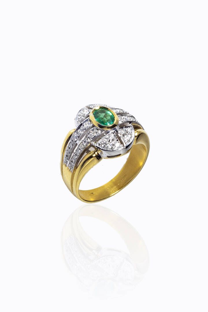 in oro giallo e bianco, sommità ovale con smeraldo taglio ovale di ct 0,38 ca e diamanti taglio brillante per totali ct 0,40 ca.
