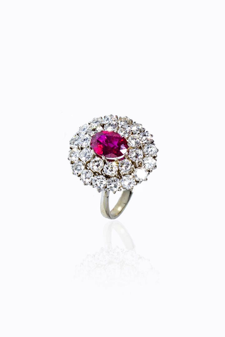 in oro bianco, al centro rubino taglio ovale di ct 2,0 ca e doppio contorno di diamanti taglio brillante per totali ct 3,30 ca, probabile colore G-H, purezza IF-VVS
