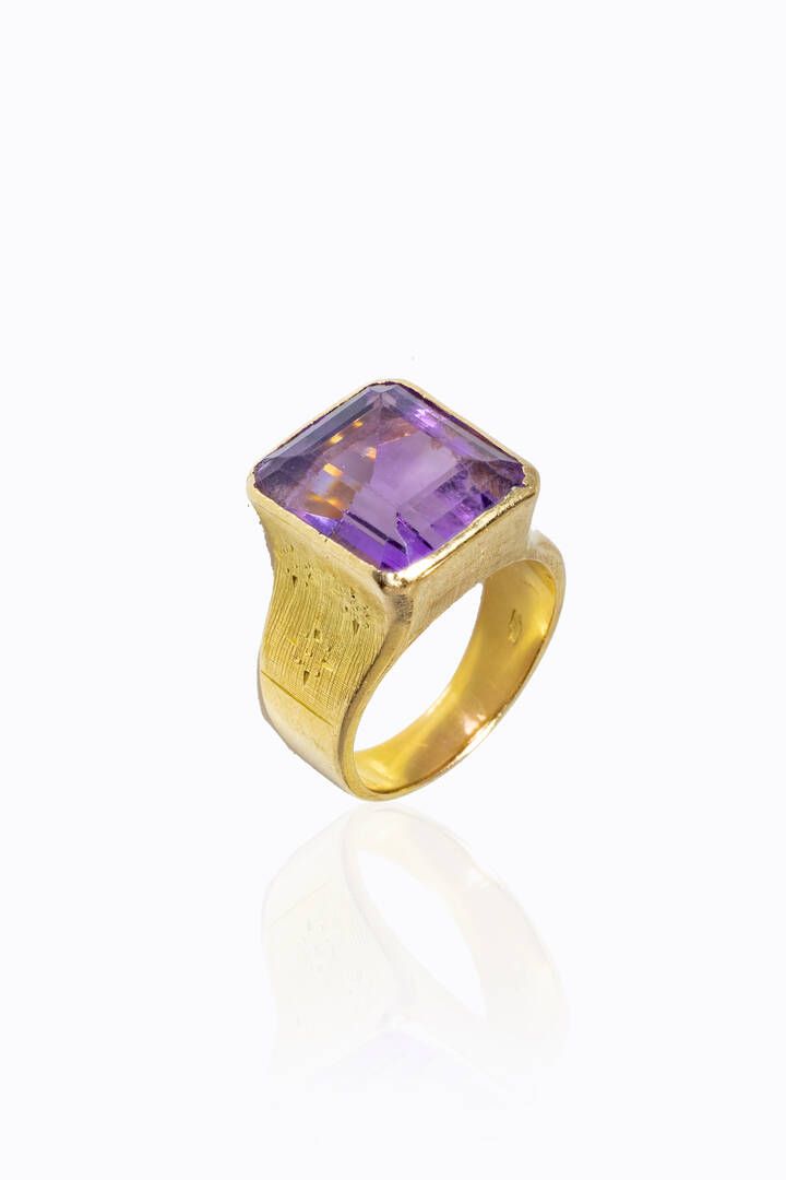 in oro giallo, al centro ametista taglio ottagonale a gradini