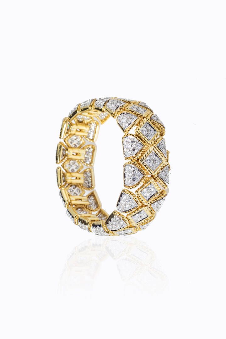 in oro giallo e bianco con bella lavorazione a corda a creare dei motivi geometrici decorati con diamanti taglio brillante per totali ct 13 ca, probabile colore G-H, purezza IF-VVS