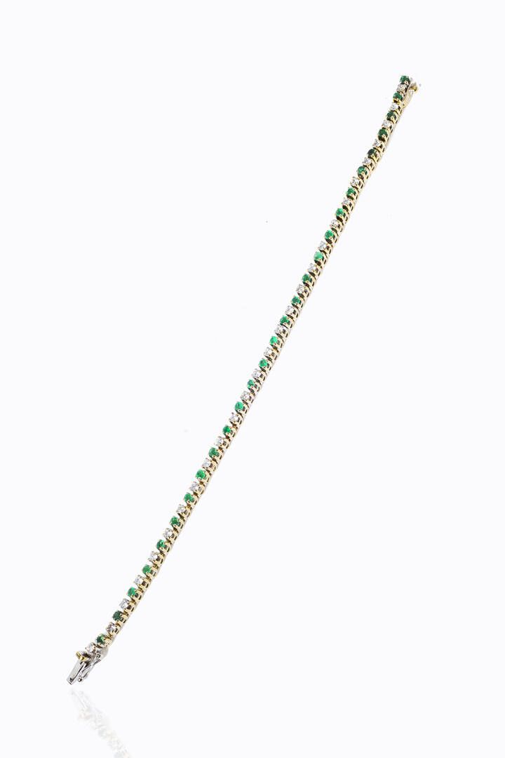 in oro giallo, modello tennis, con diamanti taglio brillante per totali ct 1,30 ca, alternati a smeraldi taglio rotondo per totali ct 1,20 ca
