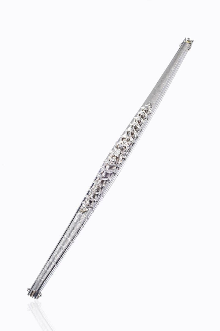 in oro bianco, anni '50, a lisca di pesce e fila centrale di diamanti taglio 8/8 e navette per totali ct 0,50 ca