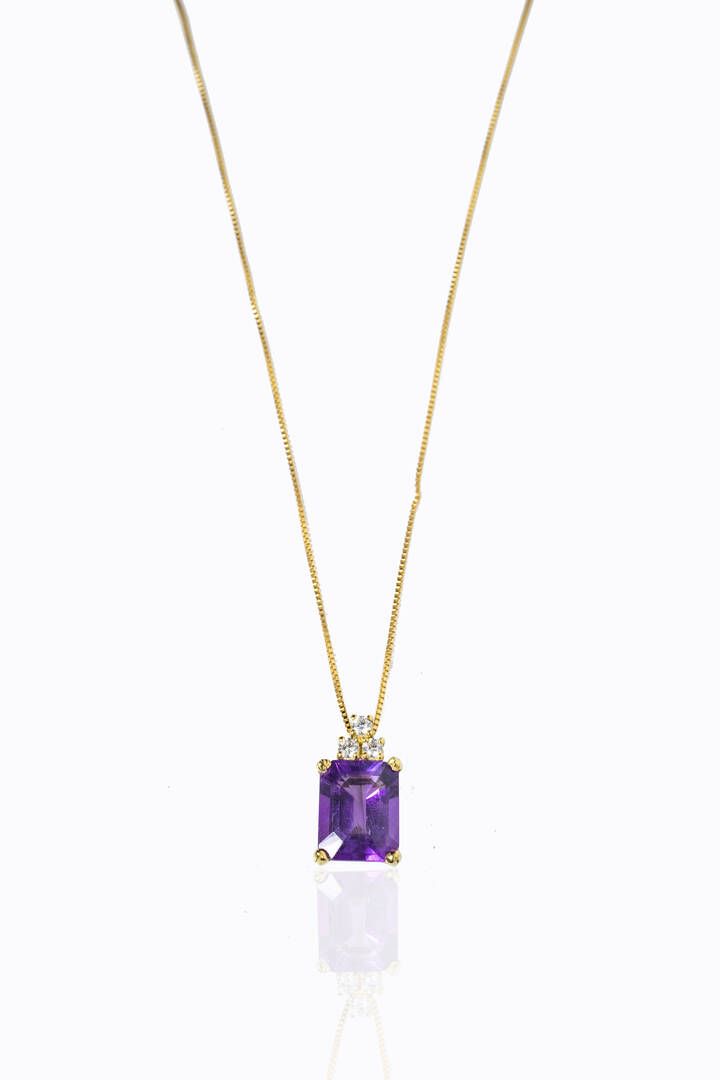 in oro giallo con ametista taglio ottagonale a gradini di ct 2,90 ca e tre diamanti taglio brillante per totali ct 0,15 ca, probabile colore G-H, purezza IF-VVS