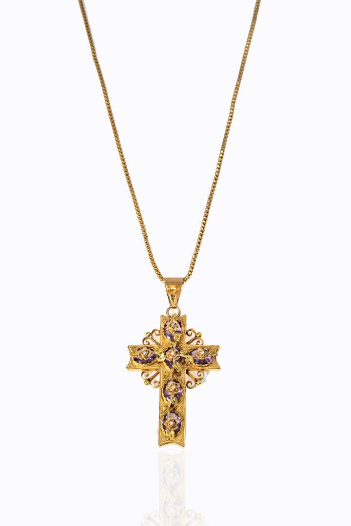 in oro giallo, XIX secolo, a forma di croce con ametiste e perline