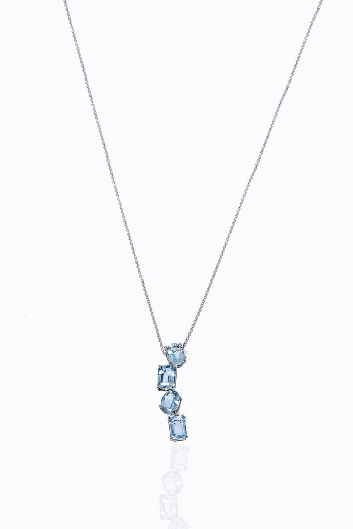 in oro bianco con quattro acquamarine taglio ovale e rettangolare disposte in verticale per totali ct 4,70 ca