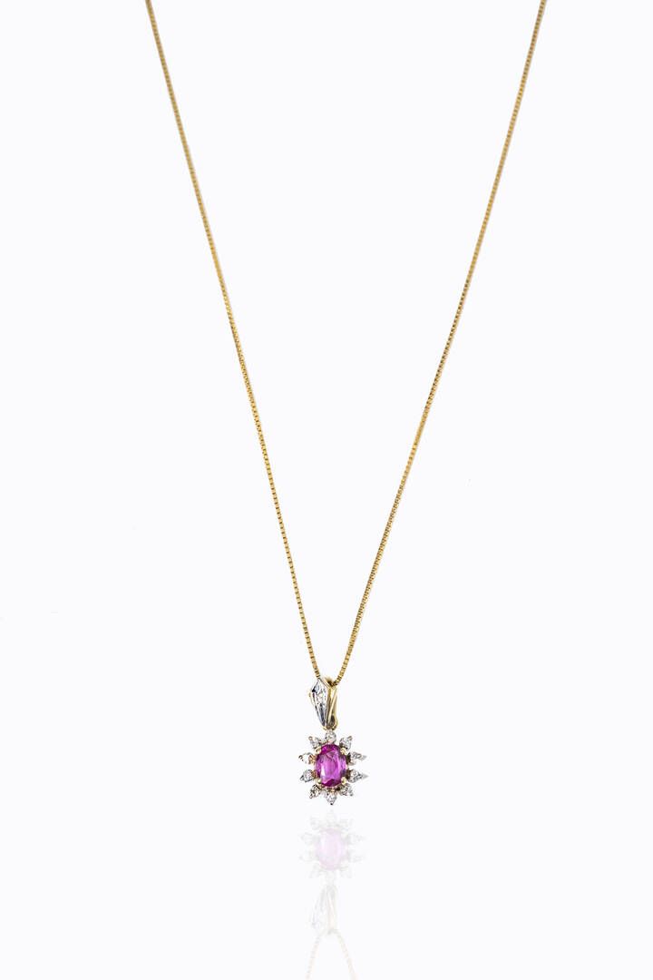 in oro giallo con ciondolo in oro a bassa caratura, a forma di margherita, con al centro un rubino taglio ovale di ct 0,40 ca, contornato da diamanti taglio 8/8 per totali ct 0,10 ca