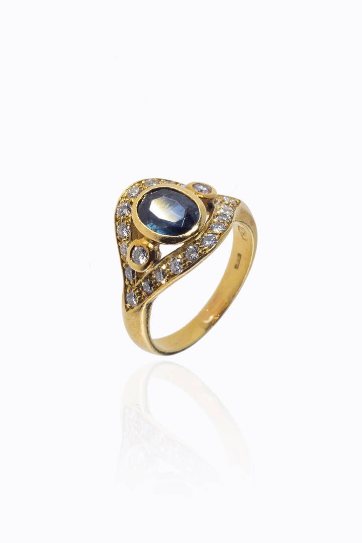 in oro giallo, al centro zaffiro taglio ovale di ct 1,0 ca e sui lati, mossi, diamanti taglio brillante per totali ct 0,30 ca