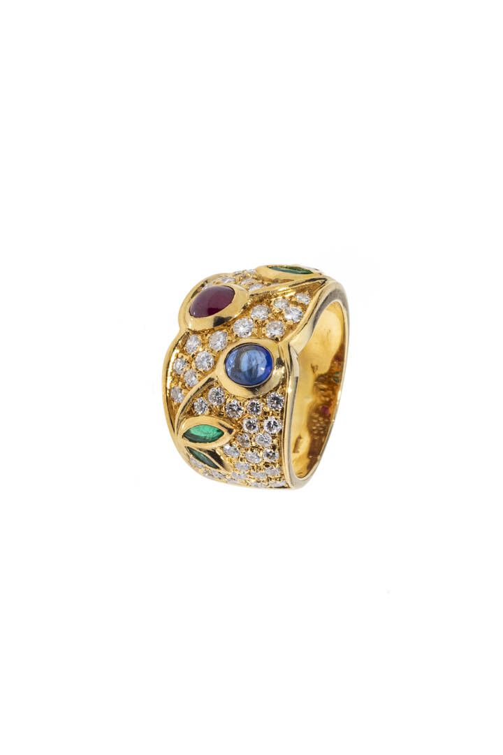 in oro giallo, a fascia, con diamanti taglio brillante per totali ct 0,60 ca, zaffiro e rubino cabochon per totali ct 0,40 ca e due smeraldi taglio navette per totali ct 0,25 ca