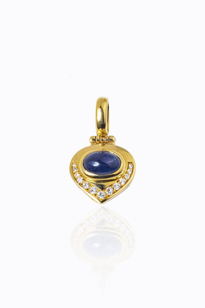 in oro giallo, a cuore, con zaffiro cabochon di ct 4.50 ca e diamanti taglio brillante per totali ct 0,50 ca, probabile colore G-H, purezza IF-VVS