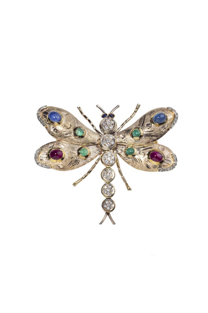in oro giallo e bianco, a forma di libellula, con diamanti taglio brillante per totali ct 0,35 ca, rubini, smeraldi e zaffiri cabochon per totali ct 5,0 ca