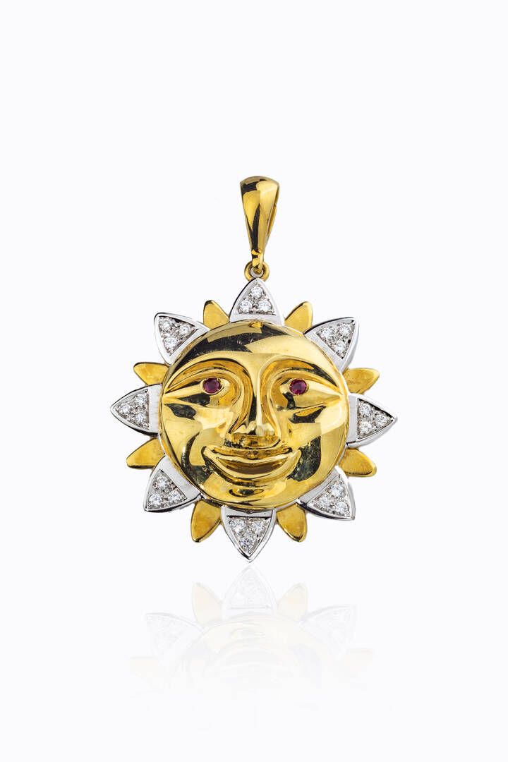 in oro giallo e bianco, a forma di sole stilizzato, con diamanti taglio brillante per totali ct 0,87 ca