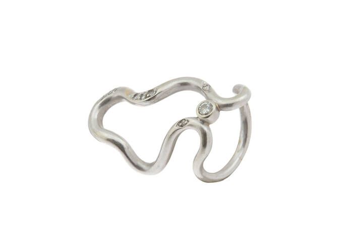 Anello in oro bianco, sommità a voluta con piccoli diamantini e 8/8 per totali ct 0,15 ca