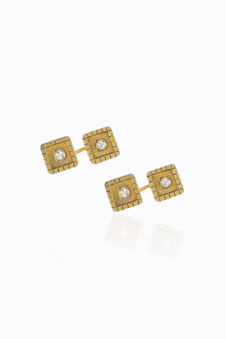 in oro giallo, sommità quadrata, con al centro due diamanti taglio 16/16 per totali ct 0,20 ca