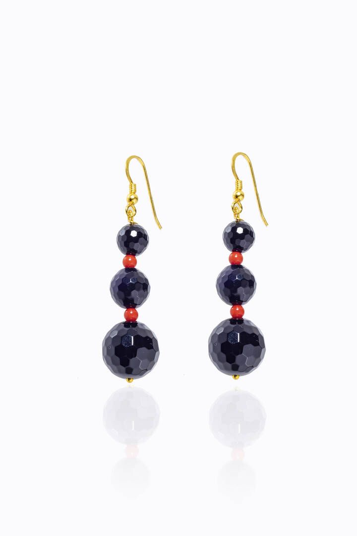 pendenti, ad amo, in argento dorato con sei sfere di onice briolette e distanziali sfere rosse.