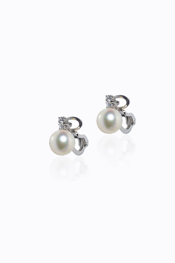 in oro bianco, a clip, con due perle giapponesi del diam. di mm 8,7, sormontate da quattro diamanti taglio brillante per totali ct 0,15 ca