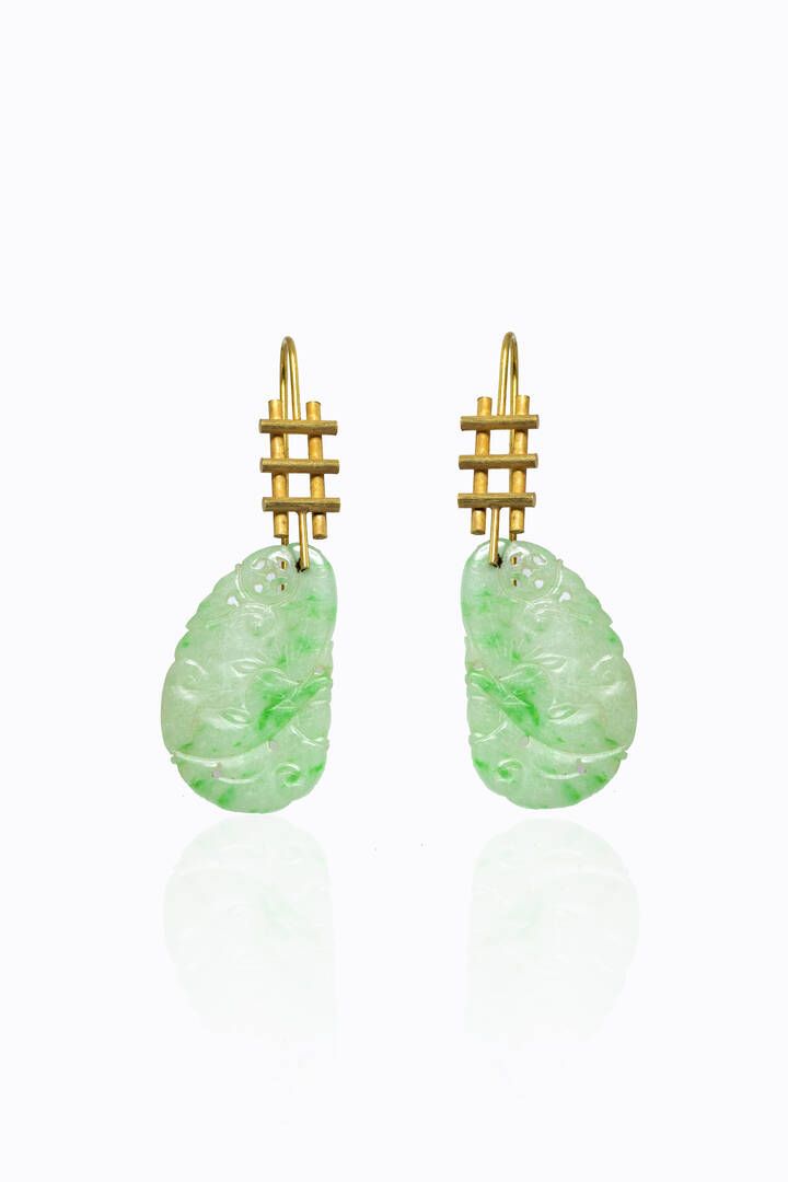 in oro giallo satinato. ad amo, con elementi geometrici terminanti con due gocce in giada traforata ed incisa