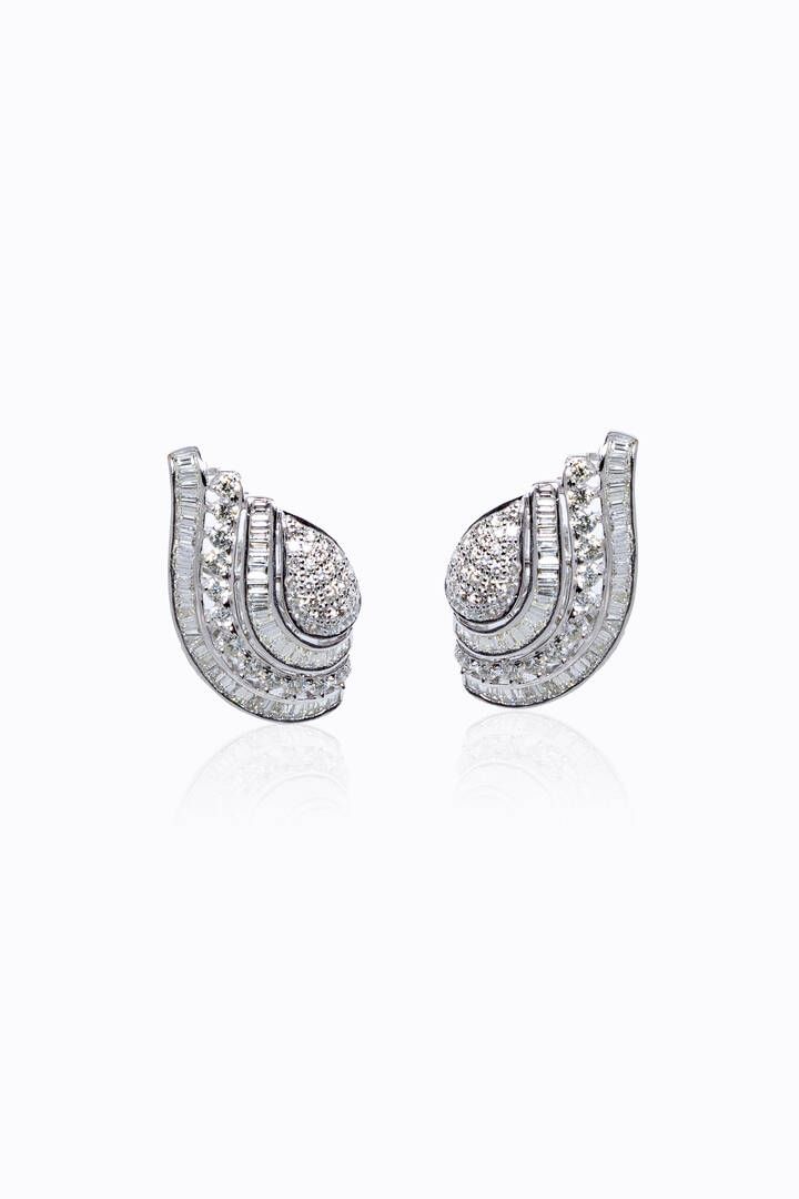 in oro bianco, a lobo, a forma di volute con diamanti taglio brillante, trapezi e baguette per totali ct 5,50 ca,