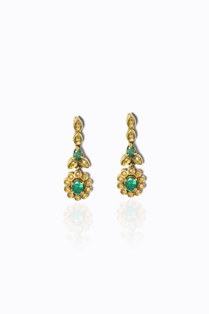 pendenti, in oro giallo con fiori in smeraldi taglio ovale per totali ct 1,50 ca e piccoli diamanti taglio 8/8 per totali ct 0,15 ca