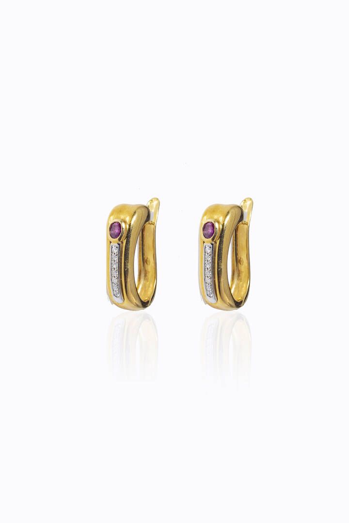 in oro giallo, a cerchio ovalizzato, parte anteriore con due rubini taglio ovale per totali ct 0,30 ca e diamanti taglio brillante per totali ct 0,15 ca