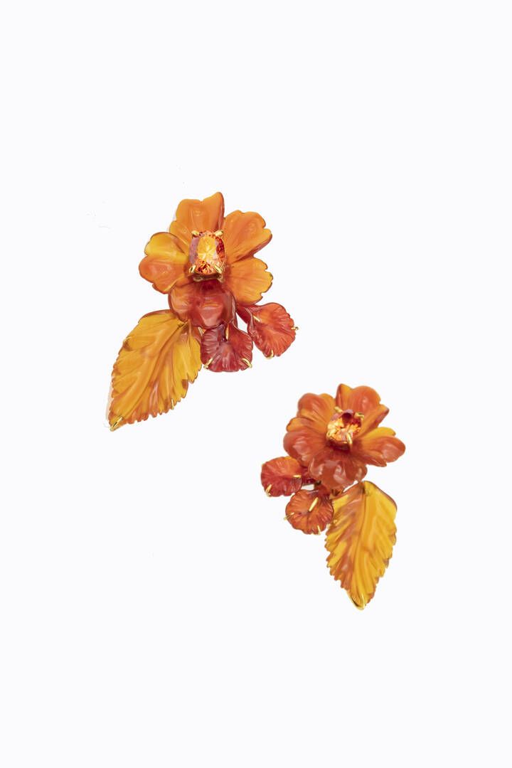 in oro giallo con corniole incise a motivi floreali. al centro due quarzi sintetici arancio