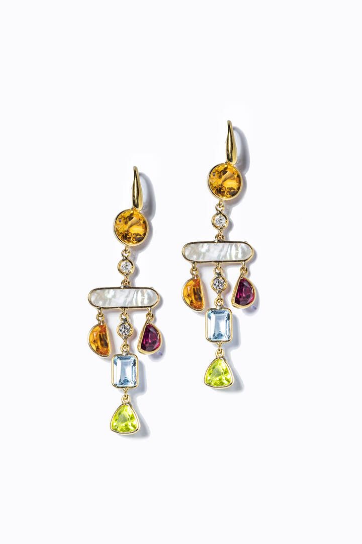 pendenti, in oro giallo, ad amo, con pietre fini di vari tagli e misure, madreperla e diamanti taglio brillante per totali ct 0,41 ca