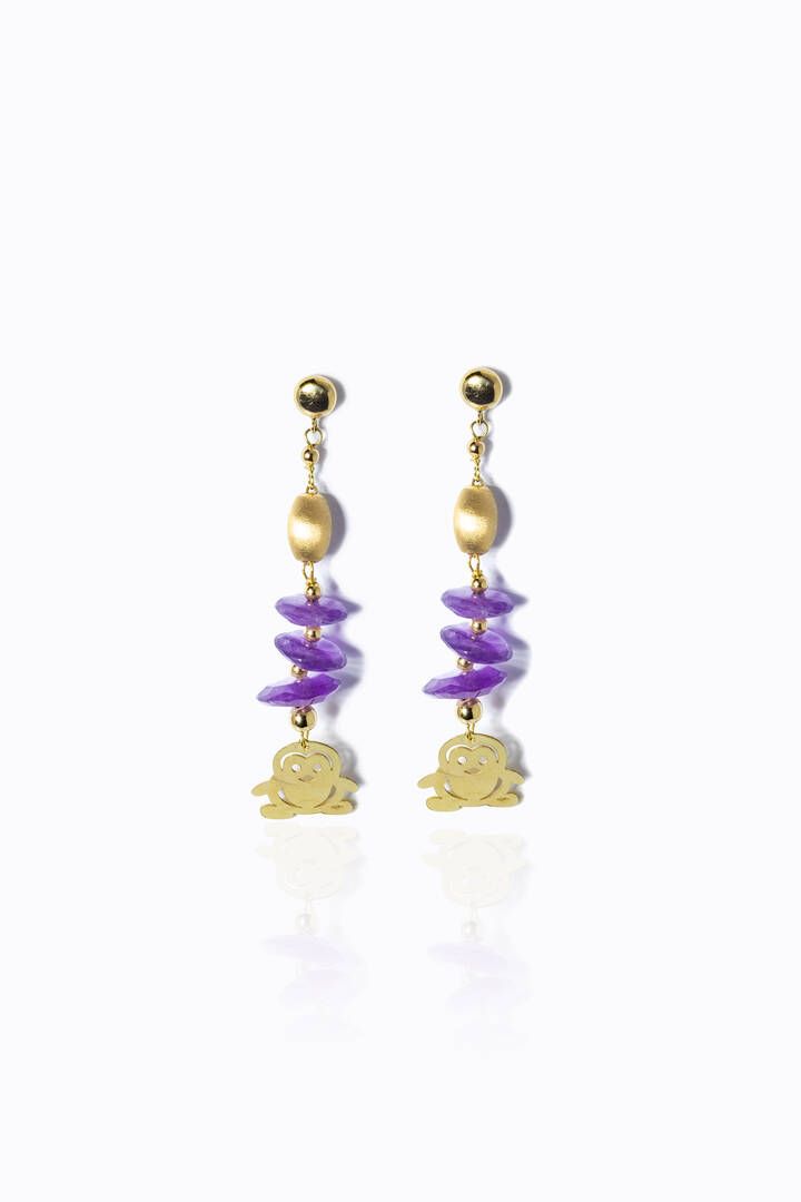 pendenti, in oro giallo, con dischi di ametiste e terminanti con due pinguini.