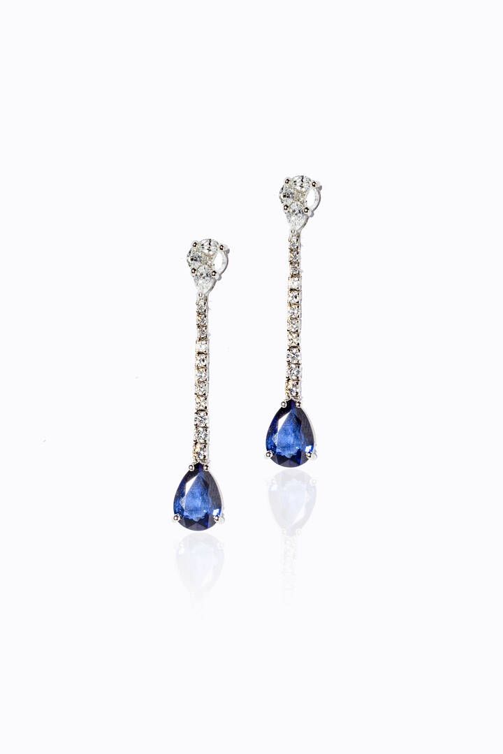pendenti, in oro bianco, con diamanti taglio brillante, navette, princess e goccia per totali ct 1,20 ca, probabile colore G-H, purezza IF-VVS, terminanti con due zaffiri taglio a goccia per totali ct 3,35 ca