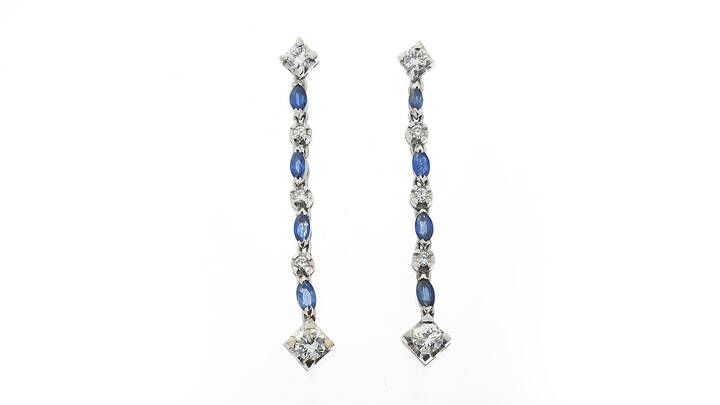 pendenti in oro bianco con diamanti taglio brillante e 8/8 per totali ct 0,65 ca (di cui uno scheggiato), alternati a zaffiri taglio navette per complessivi ct 0,50 ca