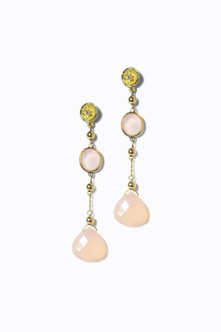 in oro giallo con quarzo rosa taglio a goccia ed ovale briolette. due diamanti taglio brillante per totali ct 0,06 ca.
