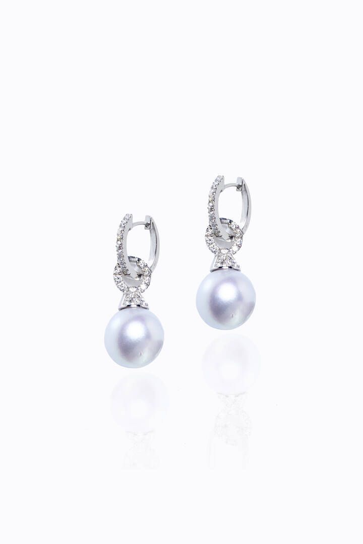 COPPIA DI ORECCHINI Peso gr 11,8 in oro bianco, cerchi ai lobi, terminanti con due perle australiane del diam. di mm 13,3 ca, sormontate da elemento geometrico in diamanti taglio brillante per totali ct 0,94 ca, probabile colore G-H, purezza IF-VVS Gli orecchini si possono scomporre ed indossare come semplici cerchi a lobo.