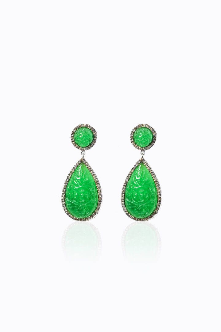 in oro giallo e bianco, con semisfere e gocce incise di giada. impreziosite da rosette di diamanti per totali ct 0,50 ca