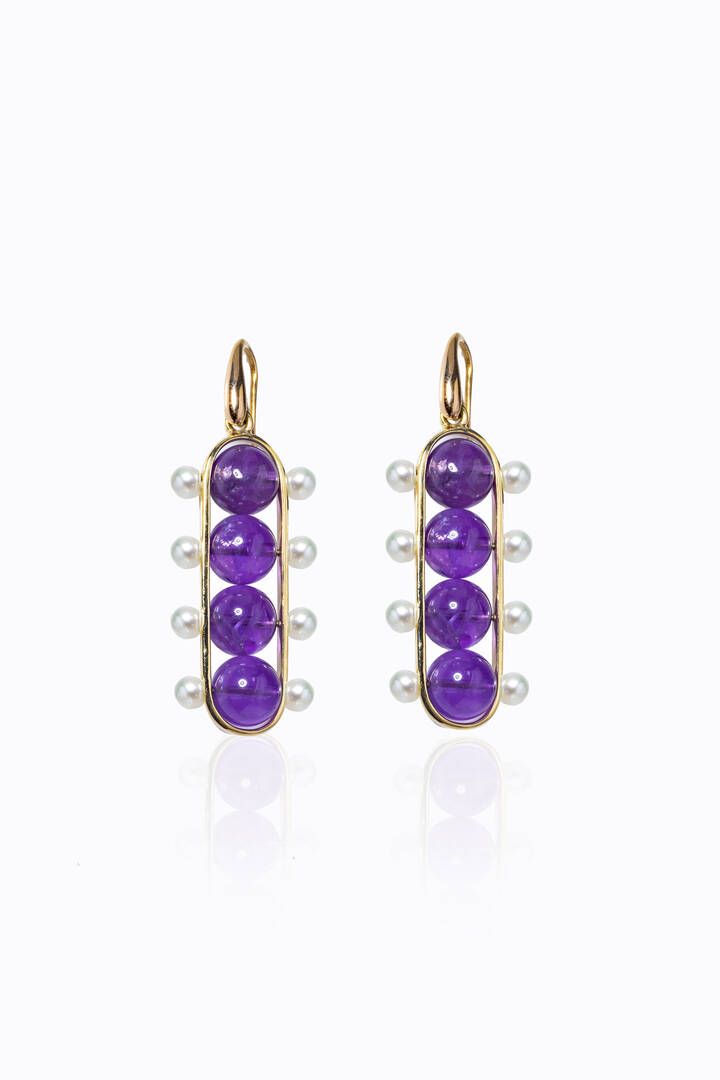 in oro giallo e rosa, ad amo, con elemento ovale disposto in verticale decorato con perline laterali ed al centro sfere di ametista