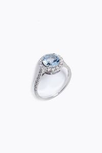 ANELLO Peso gr 3,2 Misura 13 (53) in oro bianco, al centro acquamarina taglio ovale di ct 1,23 ca, contornata [..]