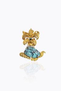 SPILLA Peso gr 24,0 Cm 5x3,5 in oro giallo e bianco, lucido e satinato, a forma di cagnolino, corpo con turchese [..]