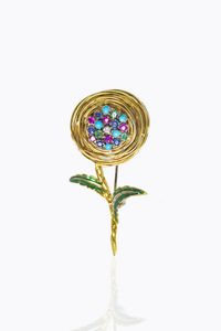 SPILLA Peso gr 28,1 Diam. cm 4 in oro giallo, lavorata a fili intrecciati, a forma di fiore, anni '50, al centro [..]