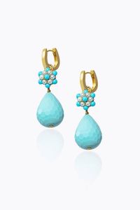 COPPIA DI ORECCHINI Peso gr 17 pendenti, in oro giallo, con fiori con sfere di turchesi e perline. terminanti [..]