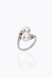 ANELLO Peso gr 6,1 Misura 13 (53) in oro bianco, modello contrarié, con due perle giapponesi del diam. di mm 8,5 [..]